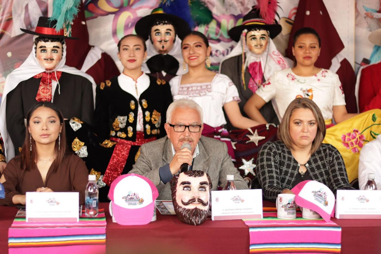 Chiautempan, Tlax.-08-febrero-2022.- El alcalde del municipio de Chiautempan, Gustavo Jiménez Romero, acompañado por Abraham Fragoso Mendoza, director de protección de patrimonio cultural, así como de autoridades representantes de las camadas; presentaron el cartel oficial del «Carnaval Chiautempan 2023», que se llevará a cabo del 17 al 26 de febrero.