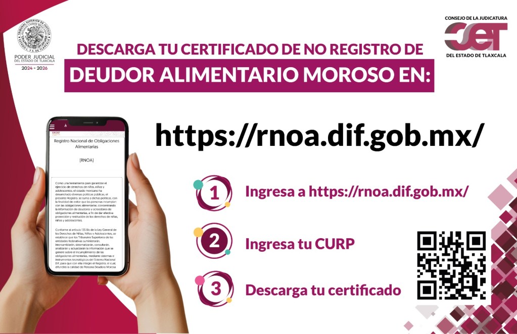 Tlaxcala, Tlax; a 28 de mayo del 2025 (Redacción).- El Poder Judicial de Tlaxcala puso en marcha una campaña de difusión sobre el Certificado de No Inscripción al Registro Nacional de Obligaciones Alimentaria (RNOA), la cual, busca concientizar e informar a los tlaxcaltecas sobre la tramitación de este documento que, a partir de este año, ya es un requisito obligatorio para realizar diferentes trámites y servicios.