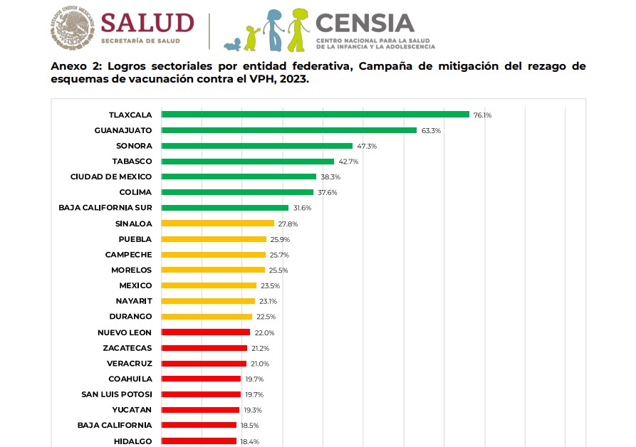 En los 32 estados del país se han aplicado 817 mil 307 vacunas contra el VPH, Tlaxcala registra la mayor cobertura en la población femenina beneficiada con el 76.1 por ciento. La vacuna contra el Virus de Papiloma Humano se aplica de forma gratuita en todos los Centros de Salud del estado para prevenir el cáncer de cuello uterino en la población femenina.