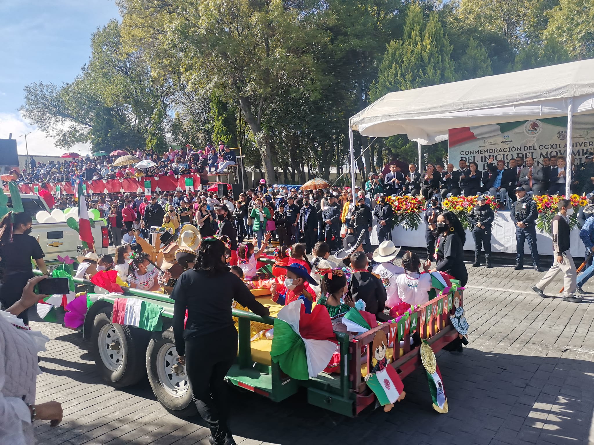 Tlaxcala, Tlax., a 15 de septiembre de 2022 (Viridiana MS).-Después de dos años de haberse suspendido los eventos masivos por la crisis sanitaria ocasionada por el virus Sars Cov-2, esta mañana se llevó a cabo el desfile conmemorativo del CCXII Aniversario de la Independencia de México en Apizaco, encabezado por el presidente municipal de Apizaco, Pablo Badillo Sánchez, acompañado de regidores, presidentes de comunidad y miembros del ayuntamiento.