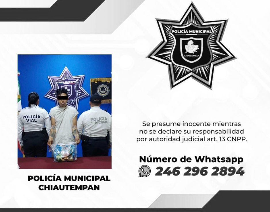 Ante este hecho constitutivo del delito y en apego a los protocolos, los policías municipales procedieron a la legal detención del sujeto y lo trasladaron a las instalaciones de la Dirección de Seguridad Pública Municipal, Vialidad y Protección Civil de Chiautempan para los trámites correspondientes.