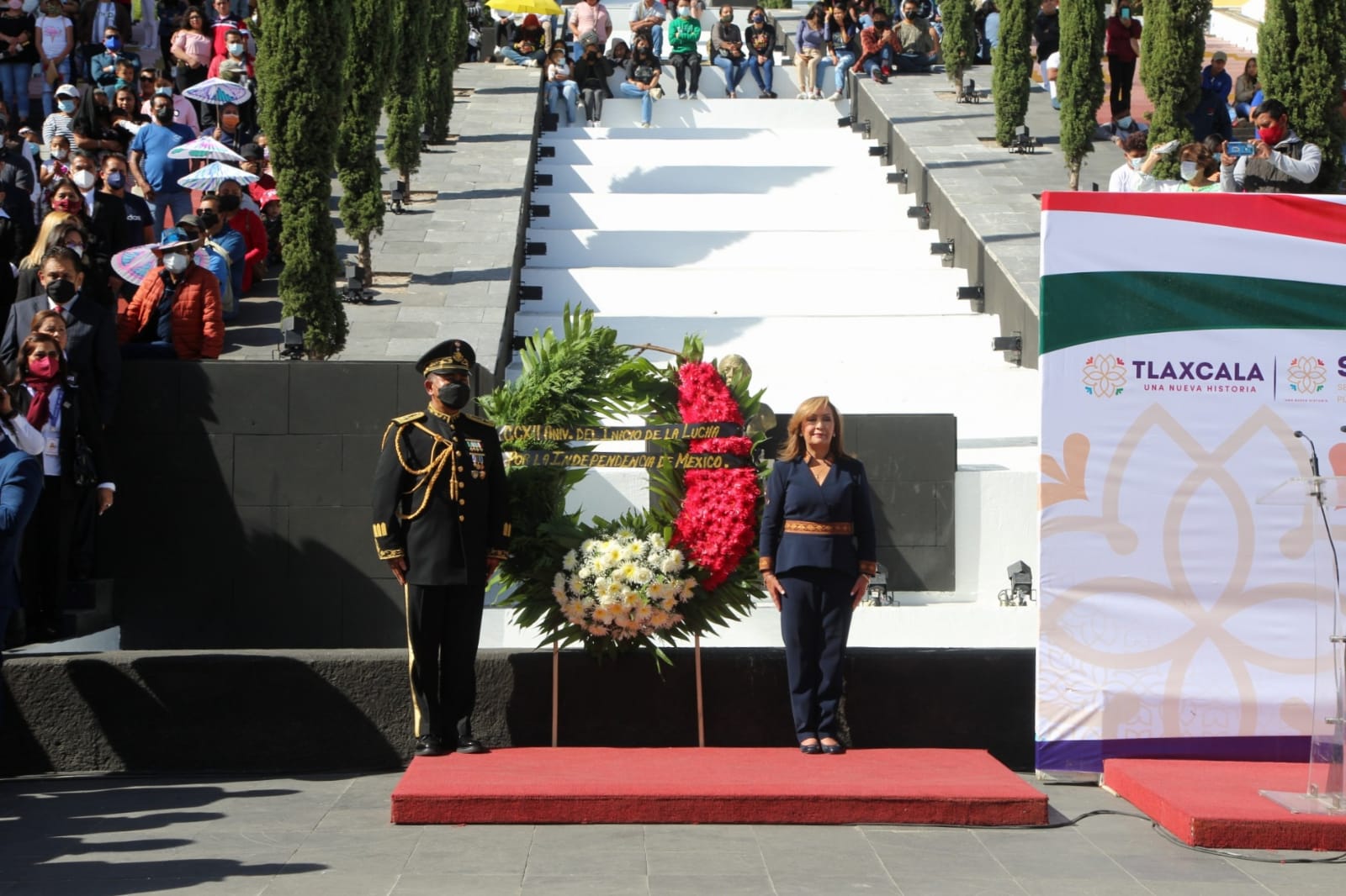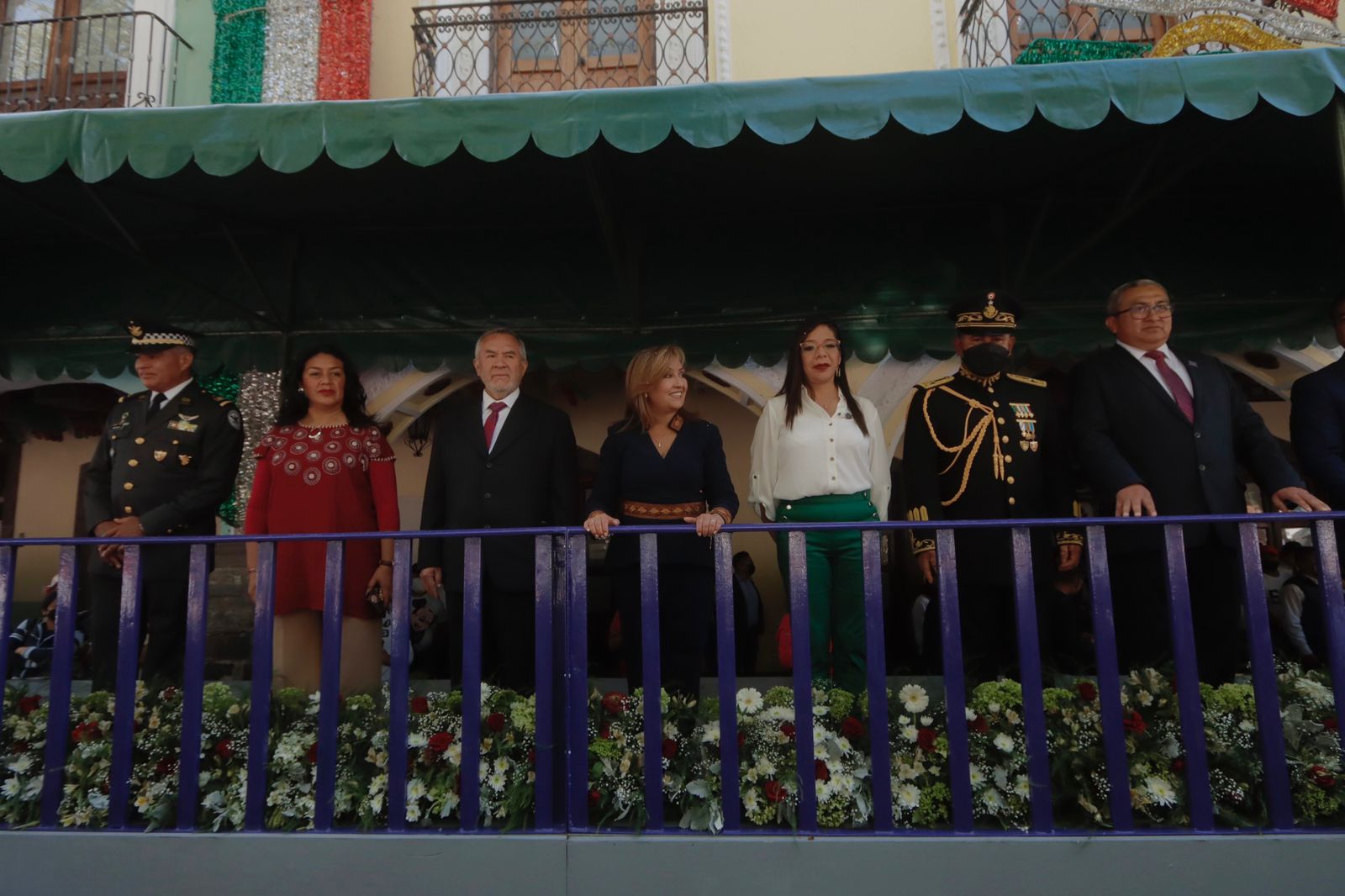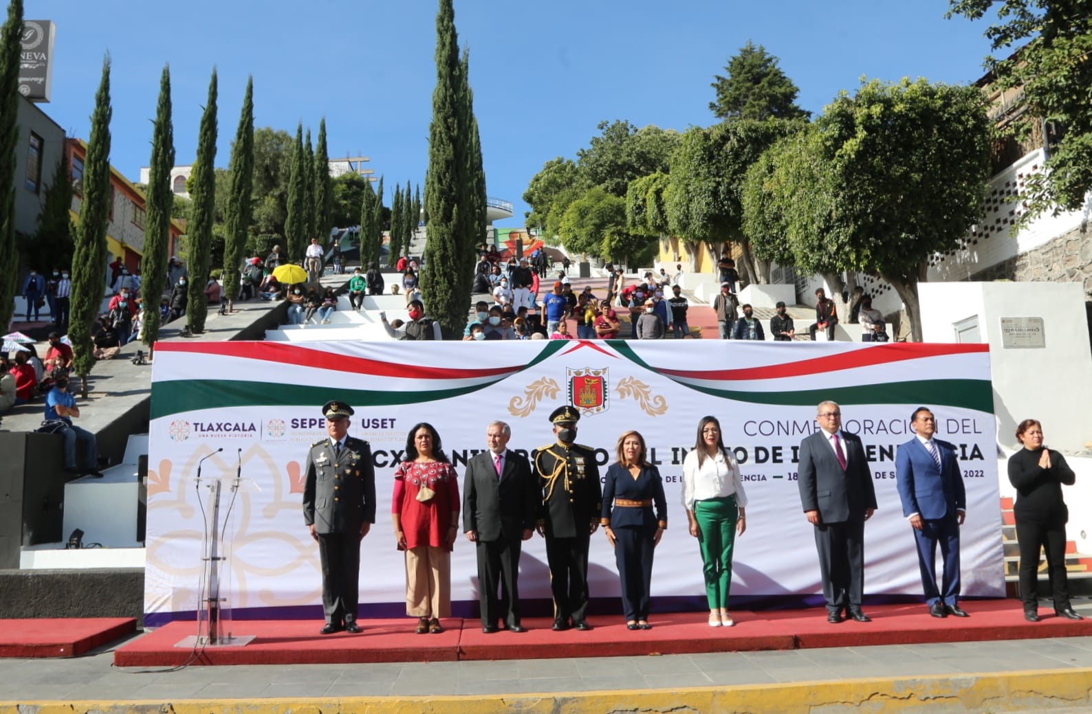 Tlaxcala, Tlax., a 15 de septiembre de 2022 (Héctor Lorenzo/ Richard Castillo).-Encabezada por la gobernadora del Estado, Lorena Cuéllar Cisneros, esta mañana se llevó a cabo una ceremonia cívica en conmemoración del CCXII Aniversario del inicio de Independencia, en las Escalinatas de los Héroes. Posteriormente las autoridades se trasladaron al primer cuadro para dar inicio al desfile cívico militar.