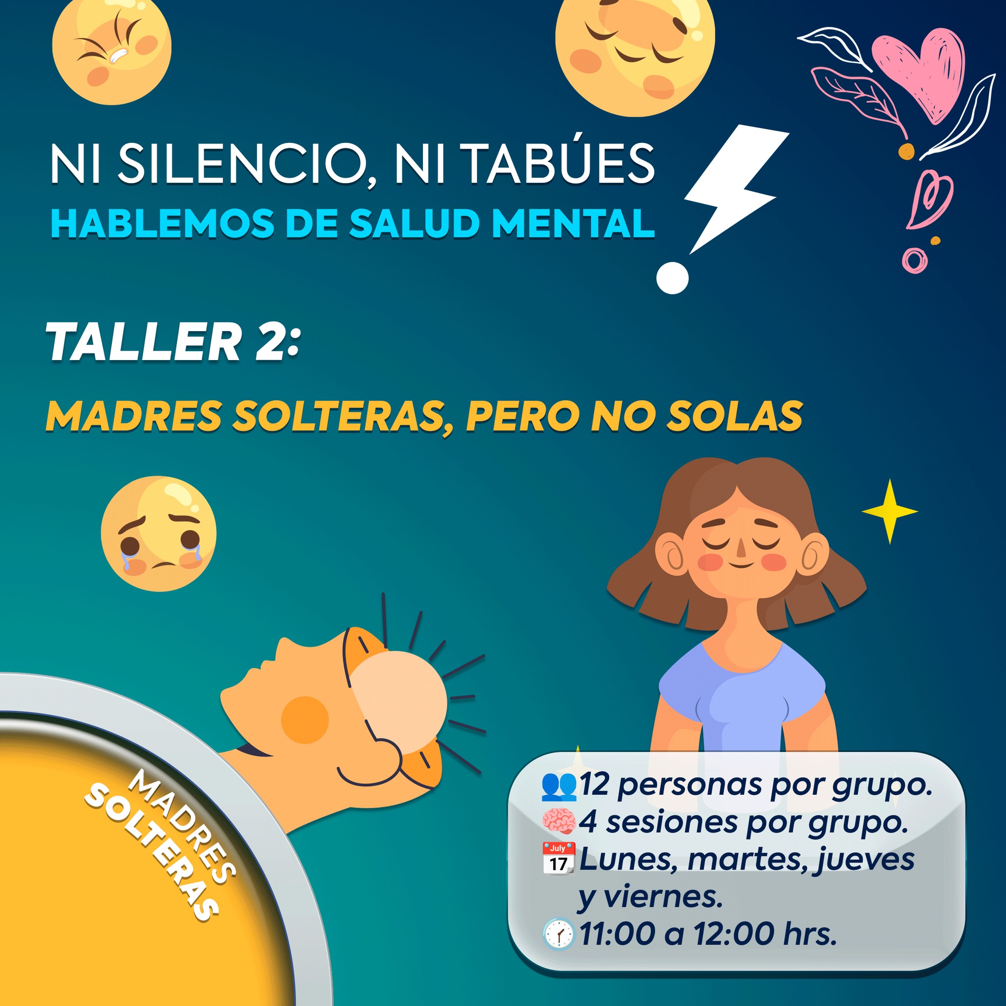 El taller “Madres solteras pero no solas”, en un horario de 11:00 a 12:00 horas.