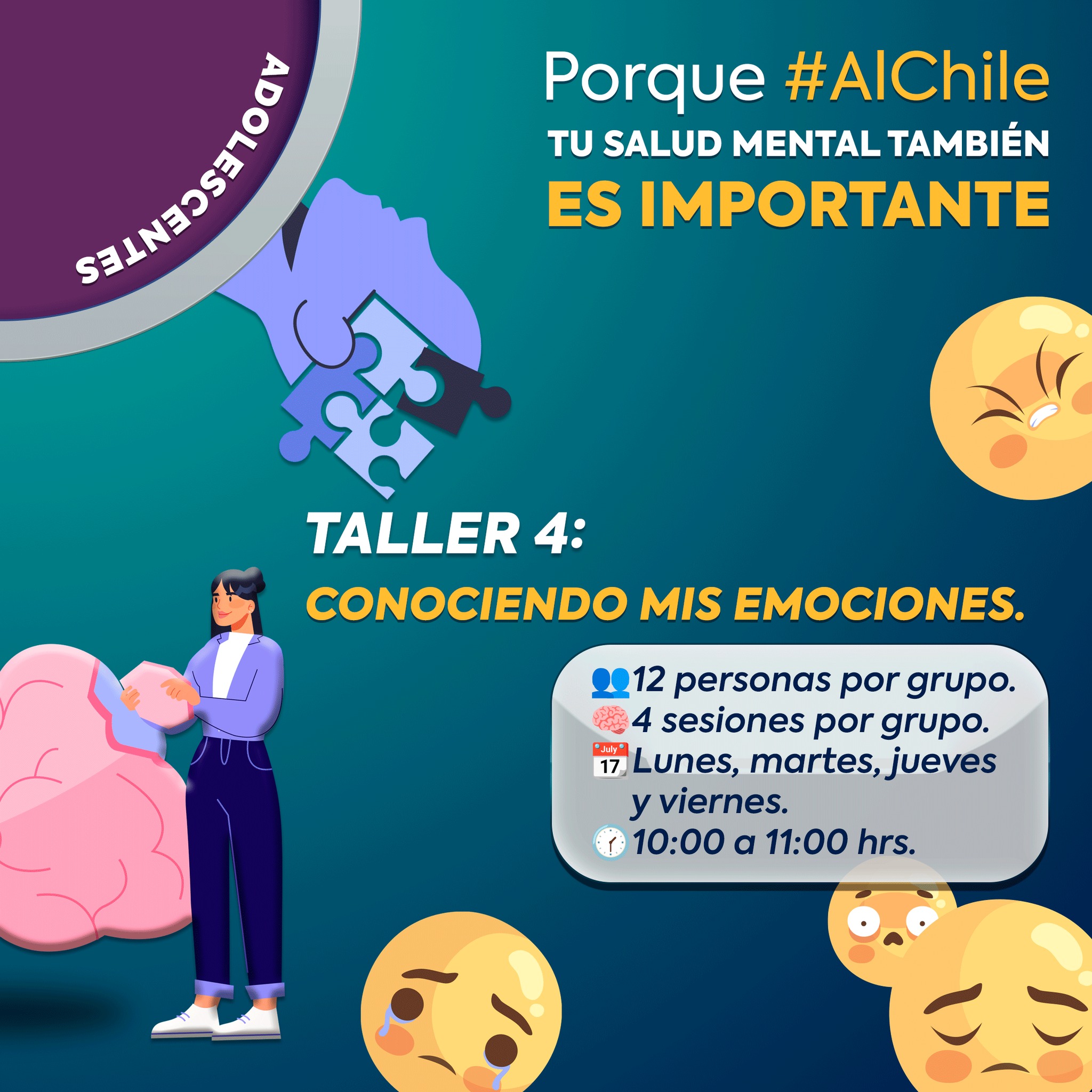 y el taller “Conociendo mis emociones”, dirigido a los adolescentes, será de 10:00 a 11:00 horas.