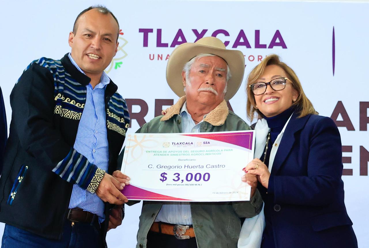 Tlaxcala, Tlax; a 19 de febrero del 2024 (Redacción). –La gobernadora del estado, Lorena Cuéllar Cisneros, a través de la Secretaría de Impulso Agropecuario (SIA), encabezó la entrega de apoyos del Seguro Agrícola para atender siniestros agroclimáticos, a 3 mil 189 productores, de 29 Ejidos del municipio de Tlaxco, con una inversión superior a 4.7 millones de pesos; además, entregó 630 mochilas aspersoras a campesinos.