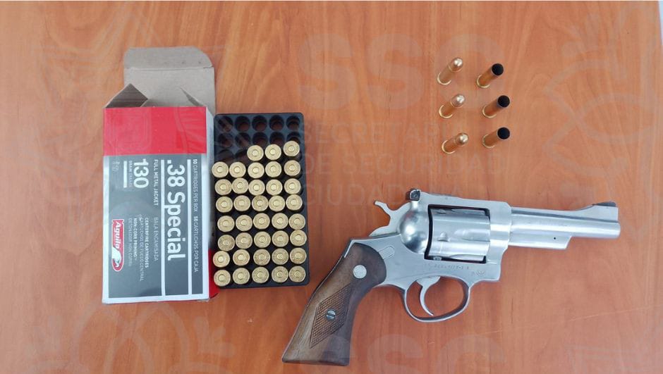 Finalmente, policías de la delegación Apizaco, detuvieron a Luis Ángel N., de 32 años por la portación ilegal de un arma de fuego calibre 357 Mágnum, abastecida con tres cartuchos útiles y una caja con 30 cartuchos útiles, calibre 38 Special, ya que no acreditó la posesión y portación del arma.