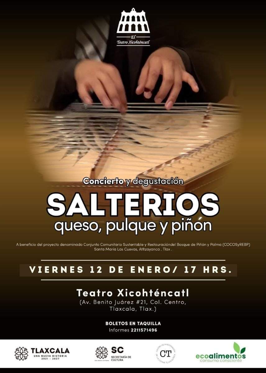 Tlaxcala, Tlax; a 09 enero del 2024 (Redacción).-El Gobierno del Estado, a través de la Secretaría de Cultura (SC) y el Teatro Xicohténcatl invitan cordialmente al concierto y degustación llamado “Salterios, queso y pulque” donde habrá distintos grupos de Salterios del municipio de Atltzayanca, productores de “Las cuevas”, la degustación estará a cargo del “Centro de Investigación y de Cocina Tlaxcalteca” y “Grupo Instituto Superior de Ingeniería Mecánica Automotriz “(Isima), en su rama de gastronomía, los objetivos son recaudar fondos para el proyecto denominado Conjunto Comunitario Sustentable y Restauración del Bosque de Piñón y Palma (CocosyRebp) de aproximadamente 400 hectáreas, de las cuales 200 sufrieron un siniestro hace casi 5 años, lo recaudado servirá para su restauración, conservación y difusión.