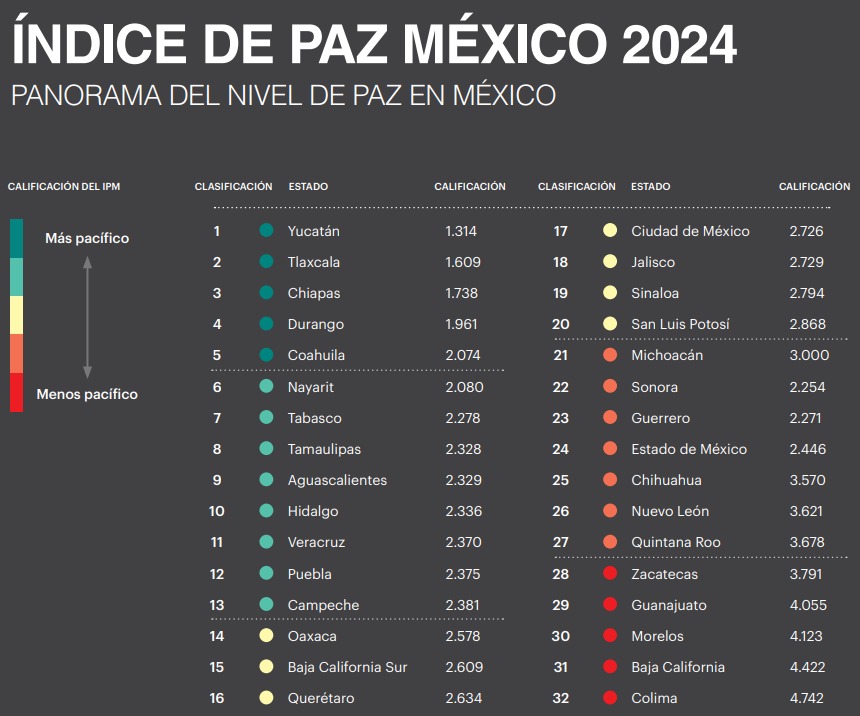 Yucatán, Tlaxcala y Chiapas estados más pacíficos